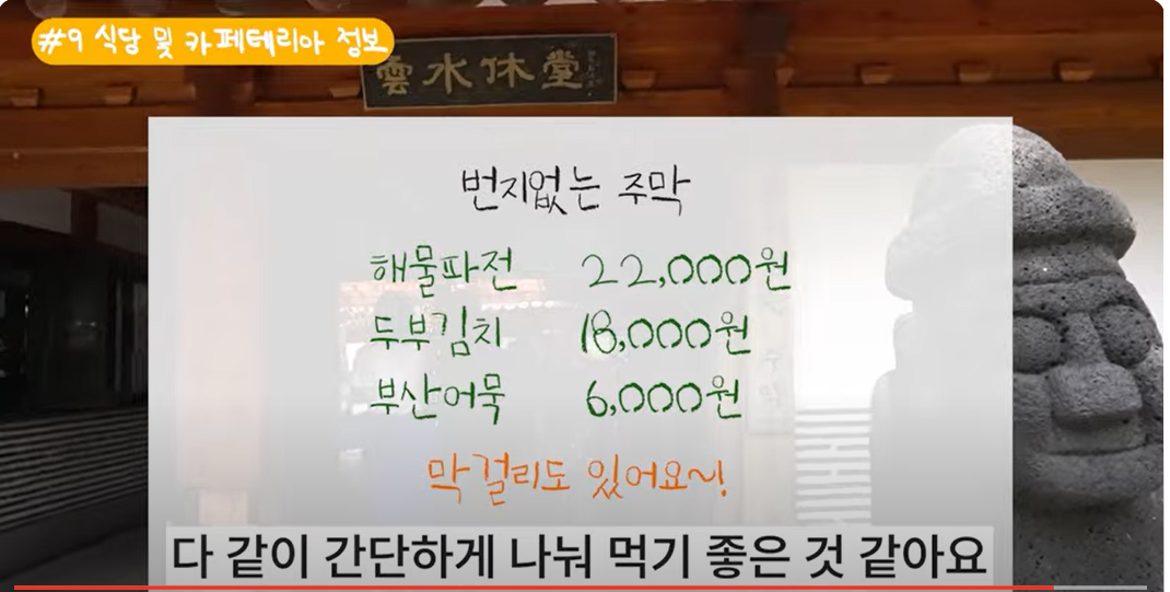 원앙연못 옆으로는 번지 없는 주막과 카페와 기념품점이 있습니다 번지 없는 주막에서는 해물파전, 막국수, 도토리묵과 같은 음식들과 막걸리를 판매하고 있는데요 실내도 깨끗하고 쾌적했고 무엇보다 넓은 통창 너머로 원학연복과 푸른 숲을 바라보며 파전과 막걸리를 즐길 수 있어서 정말 좋았습니다